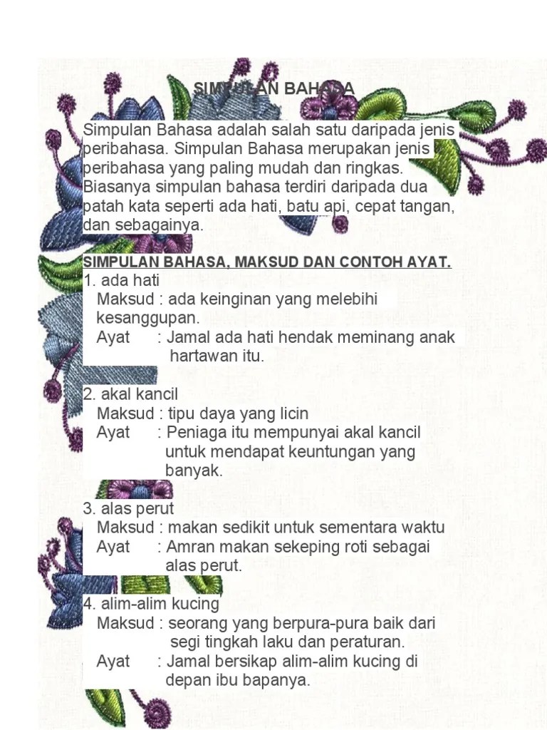 Senarai simpulan bahasa beserta dengan maksudnya adalah seperti yang berikut: